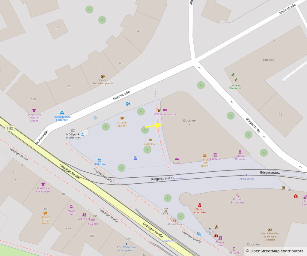 Die Praxis befindet sich an der Straßenbahnstation „Altpieschen“ im 1.OG im Elbcenter 2.